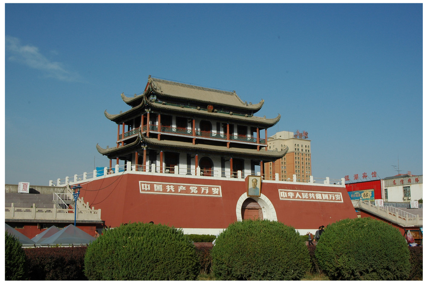 南薰门俗称南门楼,为古城银川六大城门之一,是至今完整保存下来的惟一的城门楼。南薰门通高27.5米,廊檐彩画,绚丽夺目,楼阁内设有木梯可登高远眺。清代,“南楼秋色”就被誉为宁夏八景之一。整个建筑结构严谨,雄伟壮观。相传此楼建于宋、夏时期。但史载:明洪武年间重修宁夏卫城“南曰南薰,上建南薰楼”。南薰门巍然屹立数百年,成为银川城兴衰变化的历史见证。1949年,十九兵团解放宁夏,1958年宁夏回族自治区成立,都曾在这里举行过盛大的集会和庆典,南薰楼已成为宁夏人民心目中沧桑变迁的象征。此楼曾多次修缮,并在东西两侧兴建观礼台。每逢节日,此处是举行盛大集会的场所,因南薰门的形制与北京天安门相似,故有”小天安门”之称。现为365bet足球_约彩365官方下载安装_在哪个应用商店能下载365文物保护单位。