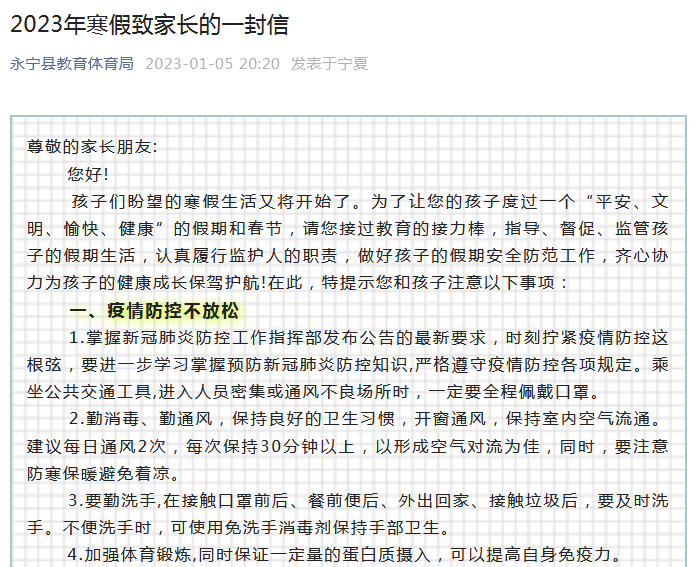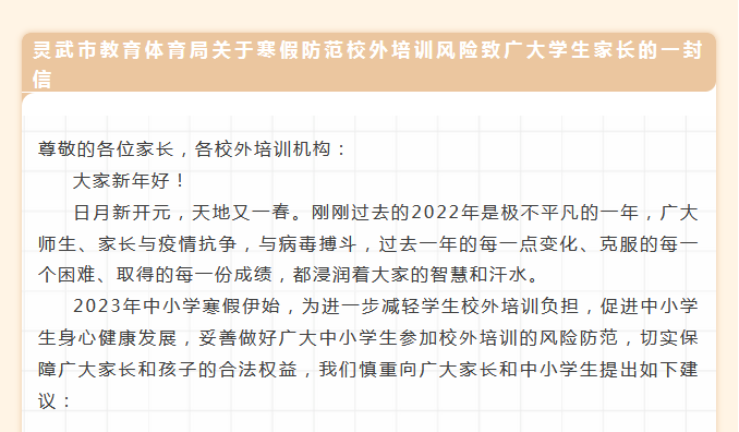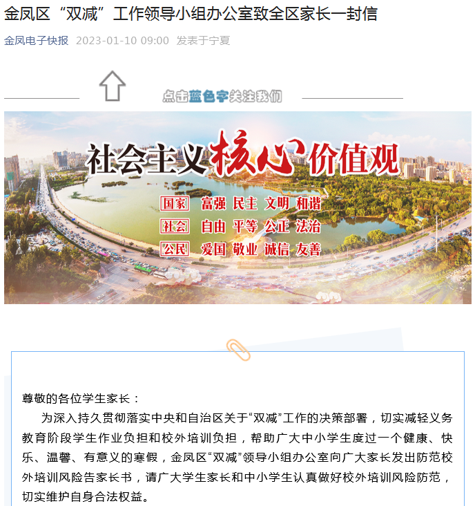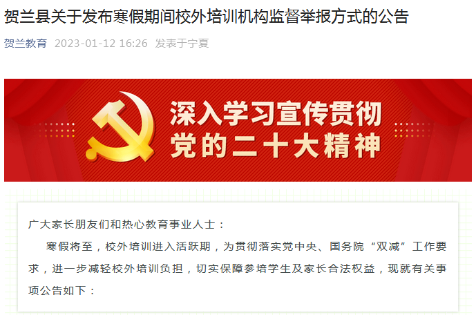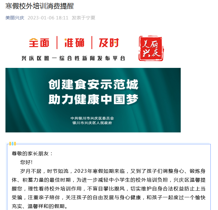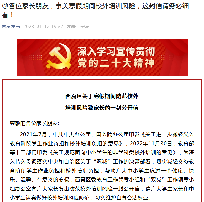 县(市)区认真贯彻落实教育部、教育厅关于做好2023年寒假校外培训治理工作的要求。近日,灵武市教育体育局、贺兰县教育体育局、永宁县教育体育局、兴庆区教育局、金凤区教育局、西夏区教育局陆续面向广大家长和培训机构发出“防范校外培训风险的公开信”,提醒家长理性选择培训机构、签订规范培训合同、通过合规方式缴费、拒绝超长期限收费、抵制高价培训收费,并向社会公开监督举报电话,共同巩固校外培训治理成果,帮助广大中小学生度过健康、温馨、有意义的假期。