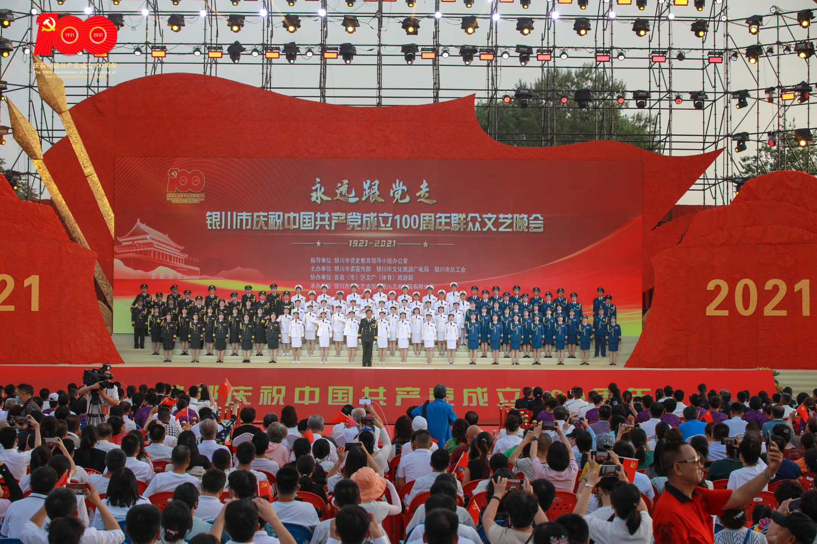 为隆重庆祝中国共产党成立100周年,回顾党的光辉历程,热情讴歌伟大的中国共产党和伟大祖国,展现全区人民新时代的崭新风采,6月25日,惠农区举办了“永远跟党走”庆祝中国共产党成立100周年文艺演出。演出以中国共产党成立100周年为主线,分为序篇、百年信仰·开天辟地、百年激荡·伟大变革、百年进程·人民至上和尾声五个部分组成。倾情回顾了建党百年来的风雨历程和峥嵘岁月,银川艺术剧院运用各种艺术形式呈现出“只有中国共产党才能救中国,才能发展中国,才能实现人民幸福、国家富强、民族复兴的中国梦”的主题。可敬可爱的演员们生动的演绎了中国共产党成立100周年的丰功伟绩以及一代代中华儿女从建党初期的探索,到如今建设新时代的百年历程,深情礼赞中国共产党人百年征程中的优秀品质。