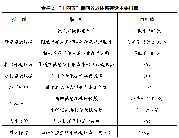 ——养老服务体系进一步完善,养老服务质量不断提升。保障基本养老服务,推动养老事业和养老产业协同发展,发展普惠型养老服务,支持家庭承担养老功能,培育养老新业态,构建居家社区机构相协调,医养康养相结合的养老服务体系,有效满足老年人多样化、多层次养老服务需求。